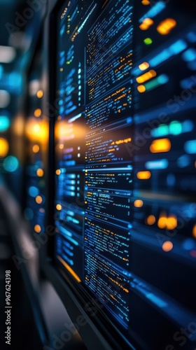 Close-up of computer screens with colorful code in a dark room, representing data analysis, programming, and cybersecurity.