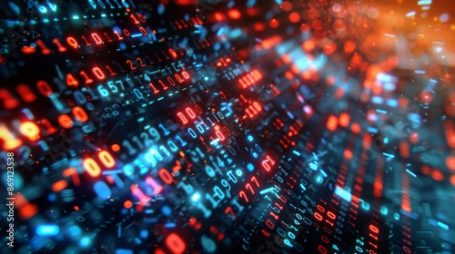 Close-up of digital encryption codes and binary patterns layered on a digital interface, symbolizing the fusion of information and technology