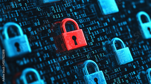 Close-up of digital locks and binary code on a futuristic digital screen.