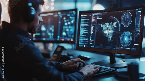 Close-up of digital marketing professional analyzing data on multiple computer screens in a modern office workspace, showcasing online advertising strategy, seo optimization, and social media campaign