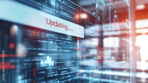 Close-up of digital screen showing software update progress bar with loading circle and "Updating..." text, surrounded by technical icons and code snippets.