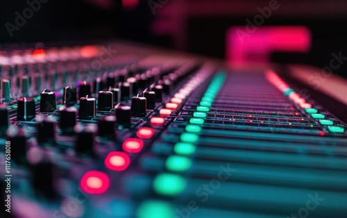 Closeup of faders and knobs on a modern mixing console, studio lighting adding depth and mood