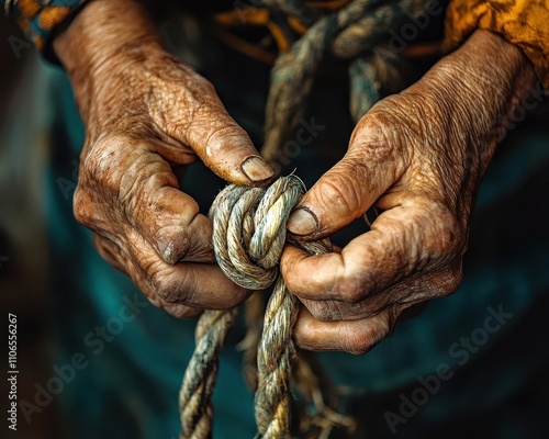 Closeup of fishers hands tying knots in fishing line, cultural craftsmanship, natural lighting