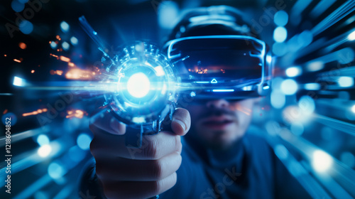 Close-Up of Gamerâs Hands with VR Weapon Controller, Immersed in Combat Sequence A close-up view of a gamerâs hands gripping a VR weapon controller, with vivid in-game objects disp