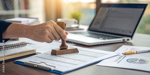 Closeup of Hand Stamping Paperwork on Office Desk with Laptop V3