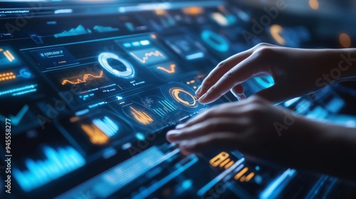 Close-up of hands selecting options on a holographic dashboard, with floating widgets and graphs.