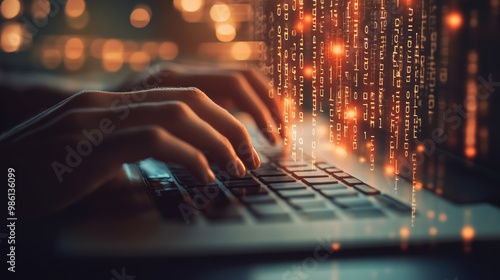 Close-up of hands typing on a laptop in a coding environment with warm ambient glow. Represents programming and software development.