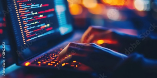 Close-up of hands typing on a laptop keyboard, with code displayed on the screen.