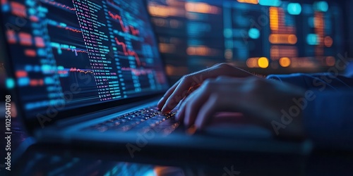 Close-up of hands typing on a laptop keyboard with code on the screen, symbolizing software development, coding, and technology.