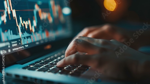 Close-up of hands typing on a laptop with stock market graphs on the screen, editorial office background. traders specializing in stocks and coins. generative AI