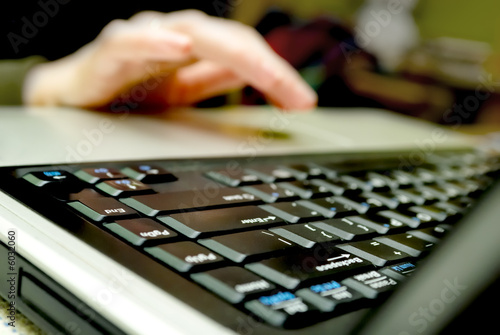 Closeup of hands typing on notebook, shallow DOF
