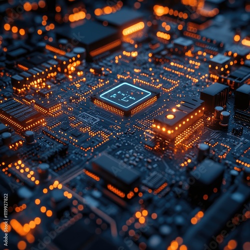 Close-up of illuminated circuit board with central processor.