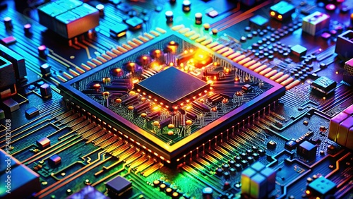 Close-up of Motherboard Circuit Board with Glowing Electrons - High-Tech Digital Background