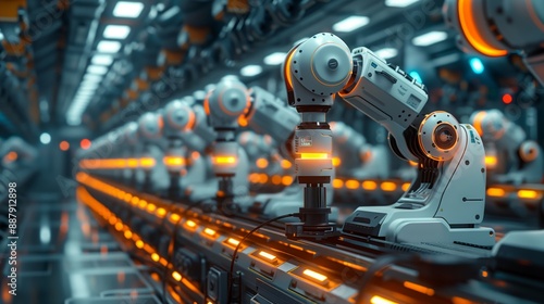 Close-up of robotic assembly line in high-tech factory. Multiple arms in operation demonstrate precision and automation in manufacturing.