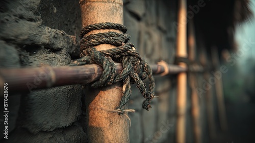 Close-up of rustic rope tied around bamboo structure