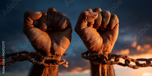 Close-up of two dark brown hands clenched in fists, bound by rusty chains against a sunset backdrop, symbolizing struggle and oppression