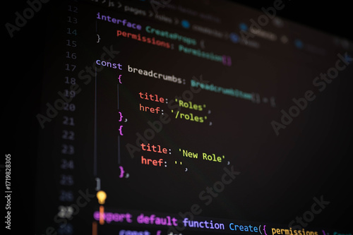 Close-up of TypeScript code displaying breadcrumb items structure with page titles and routes, representing frontend development, UI navigation, and clean code practices for modern web applications.