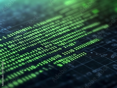 Close-up Photo: Glowing Green Binary Code Seamlessly Streaming Across a Digital Interface. AI Generated
