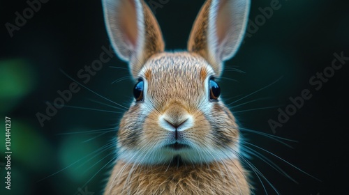 Close-up portrait of a curious brown rabbit with long ears and whiskers against a dark green background.