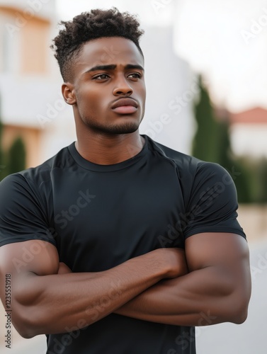 Close-up portrait of a muscular Black man with short hair, wearing a black t-shirt and a strong confident expression, standing outdoors in a residential area