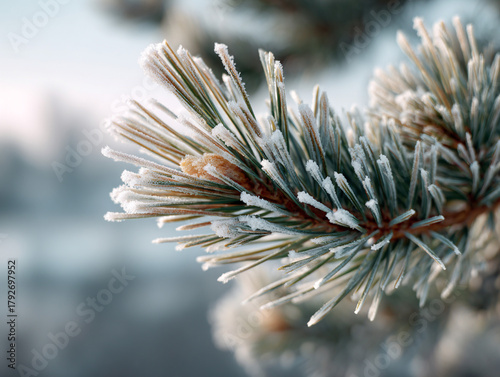 Close-up shot snow-laden pine branches.