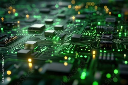 Close-up view of a circuit board illuminated by green lights showcasing technology in detail