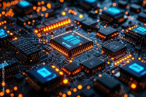 Close-up view of a complex microchip circuit board illuminated by glowing orange lights, showcasing advanced technology in action