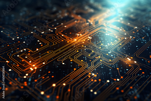 Close-up view of a computer microchip glowing with blue light, technological marvel
