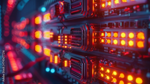 Close-up view of a data center server rack with vibrant red LED lights indicating active data processing and network operations.