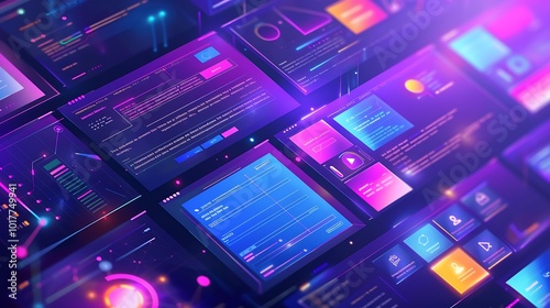 Close-up view of a futuristic digital interface with multiple screens displaying colorful data and graphic elements.