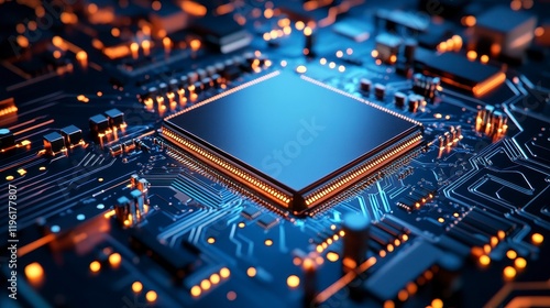Close-up view of a modern microchip on a circuit board with glowing connections and components