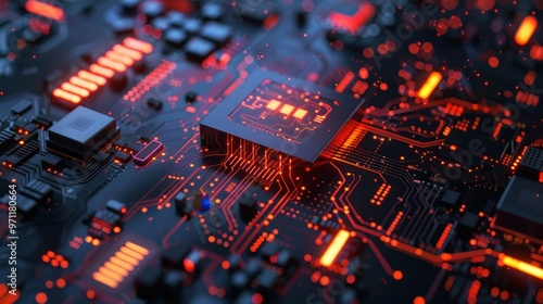 Close-up view of a vibrant microchip and circuit board glowing with red lights against a dark background at nighttime. Generative AI