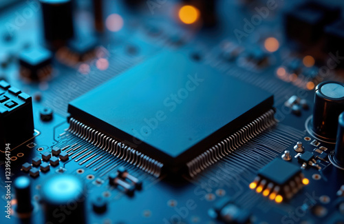 Close-up view of computer microchip. Tech components on system board highlighted. Complex circuits visible on motherboard. Advanced tech detail. Modern processing. High-tech component. Digital