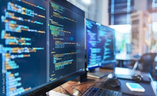 Close-Up View of Computer Screen Displaying Code in a Dimly Lit Room at Night