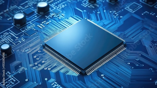 Close-Up View of Microprocessor on Circuit Board with Blue Background