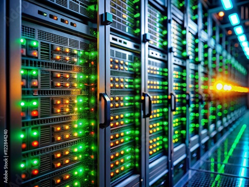 Close-up View of Server Racks Featuring Green and Orange Indicator Lights Highlighting Connectivity and Data Processing in a Modern Data Center Environment