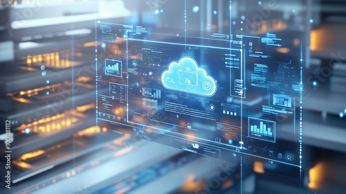 Cloud analytic tools, A vibrant holographic display projecting a cloud network analytic report in an advanced tech lab. The visualization features rotating graphs and data streams,