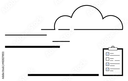Cloud and lines symbolize cloud computing and data flow. Clipboard with checked tasks suggests organization and productivity. Ideal for cloud technology, task tracking, workflow, teamwork