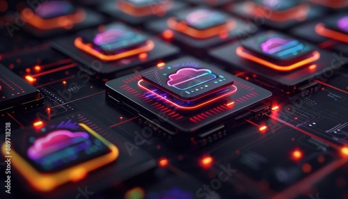 Cloud computing concept visual, closeup on a network of devices connected to the cloud, digital integration