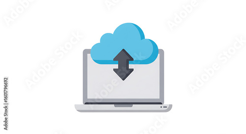 Cloud computing concept with a laptop synchronizing data. Flat vector illustration of data transfer, upload, and download for office technology.