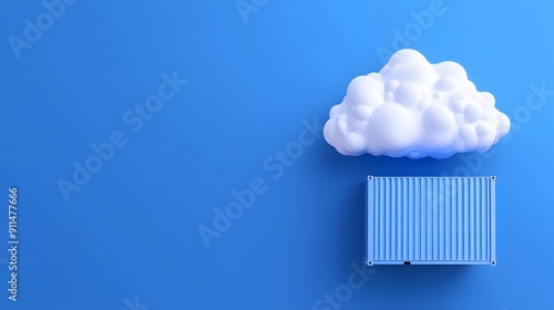 Cloud computing concept with cloud icon and cargo container on blue background, signifying data storage and technology.