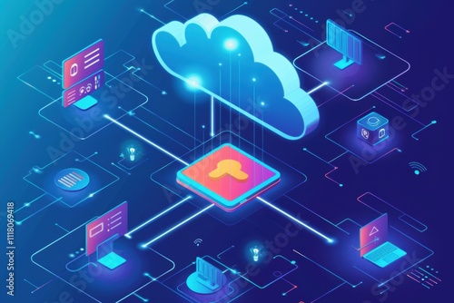 Cloud computing concept with data transfer and digital interfaces.