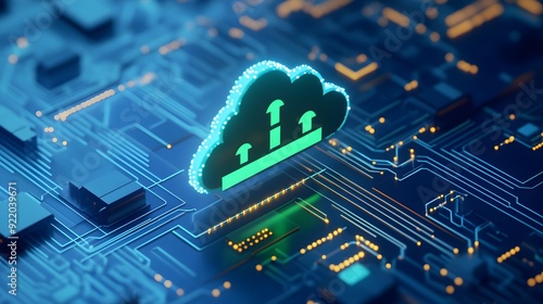 Cloud computing concept with glowing digital cloud and circuit board. Depicts data storage, network technology, and online infrastructure.