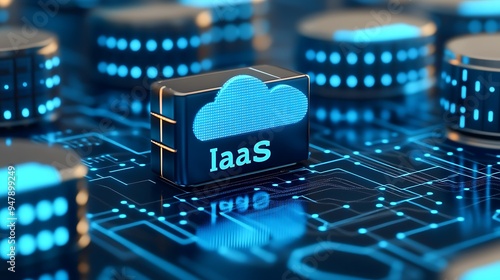 Cloud computing concept with IaaS symbol on digital circuit board, representing modern data infrastructure and virtual IT services.
