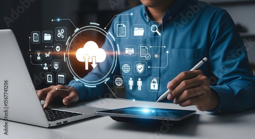 Cloud computing connection with a professional managing data on a laptop and digital tablet, using secure technology and network for remote access.