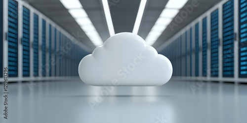 Cloud computing data center. A white cloud icon floats in a server room, symbolizing data storage and cloud services.