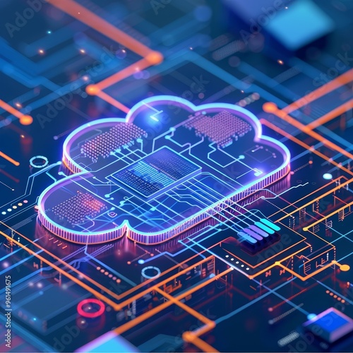 Cloud Computing, Data Storage, and Processing Futuristic 3D Render of a Circuit Board