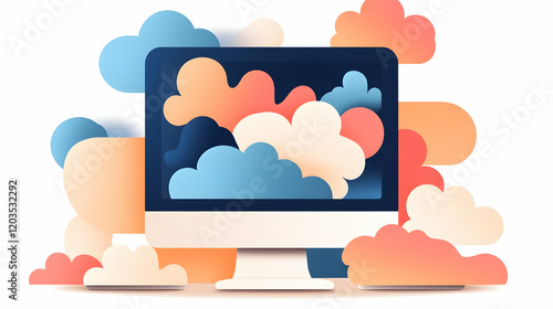 Cloud computing desktop screen, data storage, digital technology, network connection, abstract background, website design