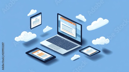 Cloud computing devices, digital data sharing, online access, global network, isometric illustration. Website design