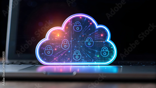 cloud computing Digital cloud security concept with glowing lock symbols on a laptop.